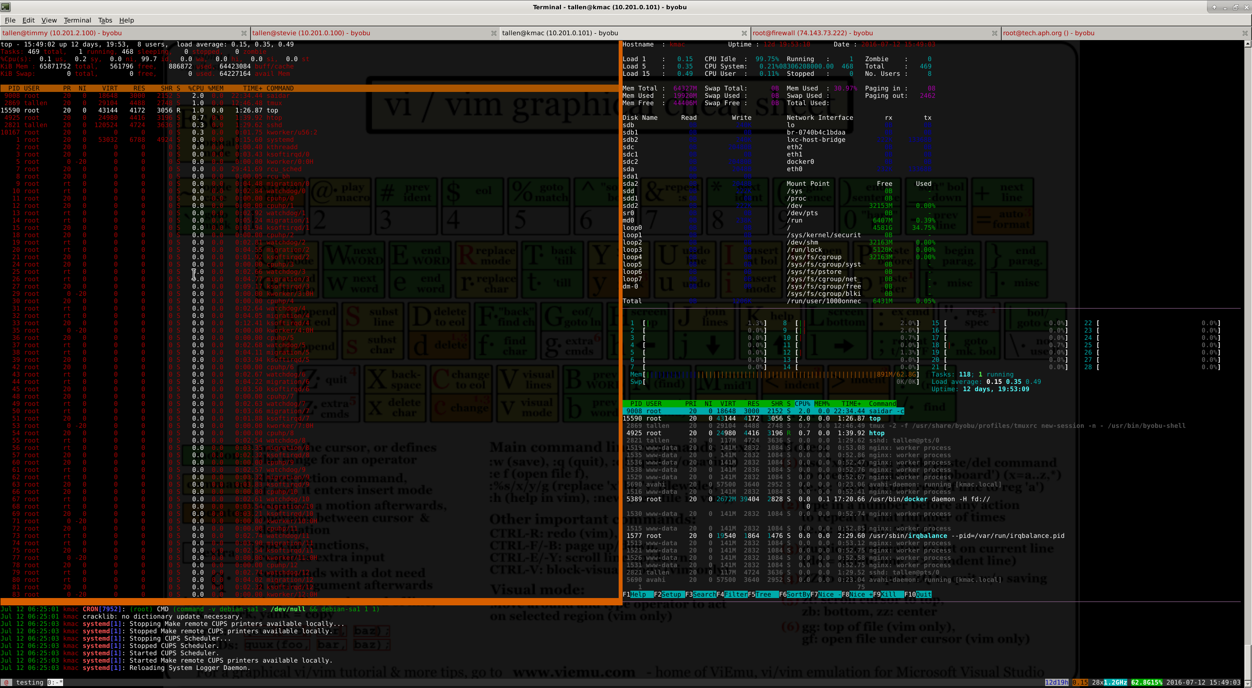 Clever things one can do with byobu / screen. I have a bunch of servers I need to monitor more or less constantly. I rigged up this aesthetically pleasing array of monitors so I get to look smart when someone, whilst I’m in the middle of programming or something, asks if server blah is having problems.