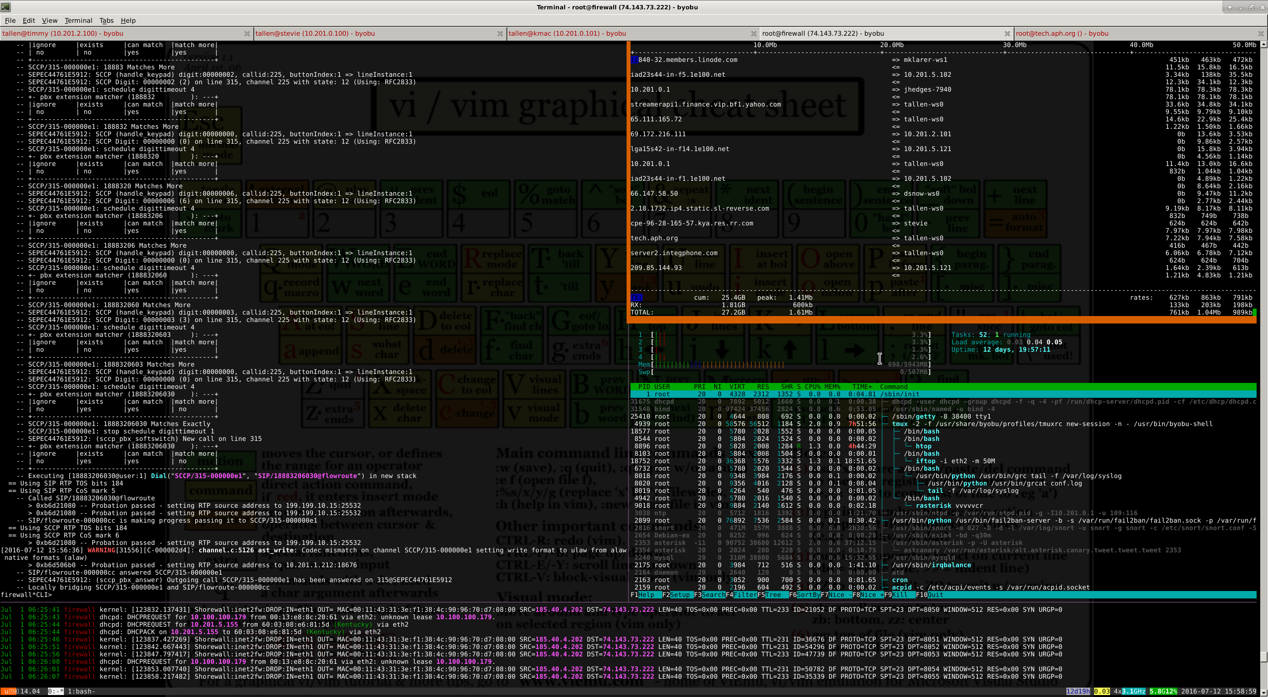 This one is of our main router / firewall / phone switch. Note the upper right pane where I can quickly sort out who’s using all the bandwidth; it’s iftop with the colorization patch. The left one is the Asterisk console. The bottom one is just syslog washed through grc.